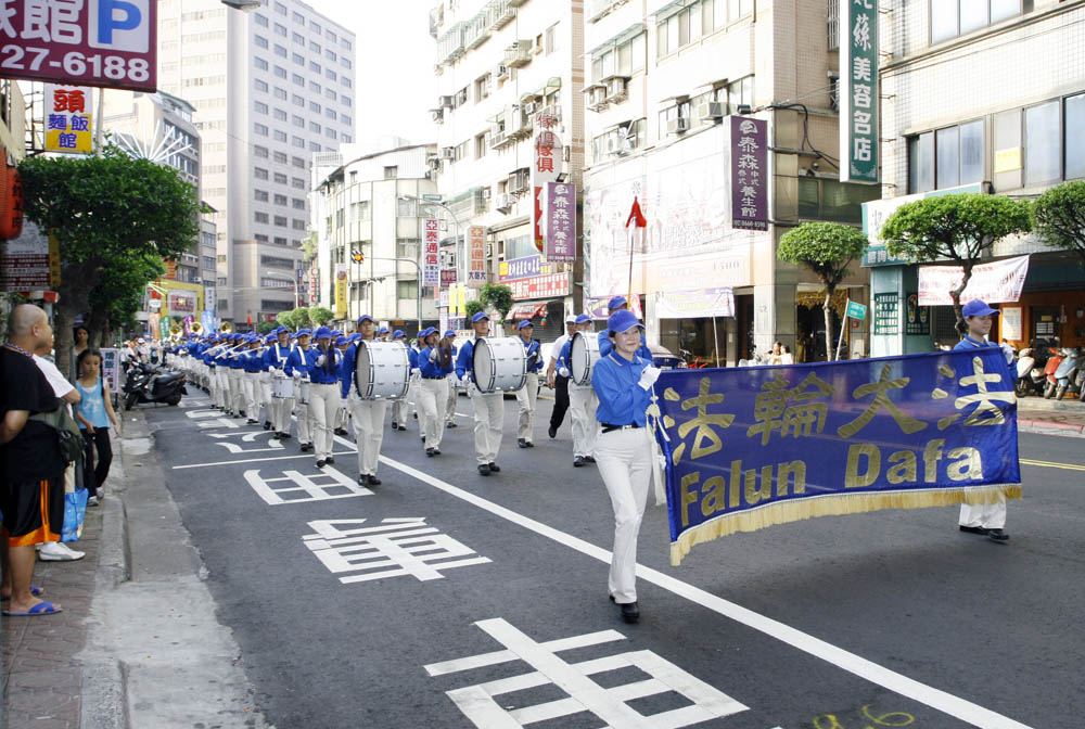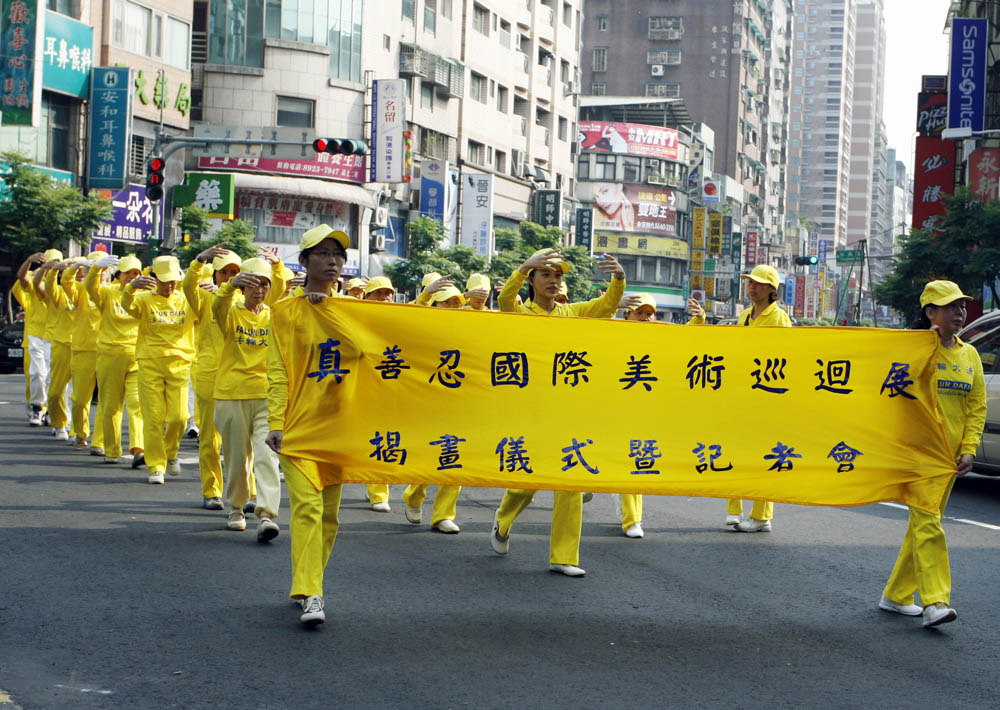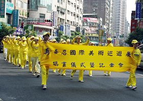 游行队伍由“天国乐团”的演奏为前导,鼓声威震四方,美丽的仙女队、可爱小朋友的腰鼓队、旗鼓队、优美的炼功队伍及整齐的腰鼓队,浩大的阵容,沿途吸引了许多民众的目光,纷纷驻足接下美展传单及小莲花。