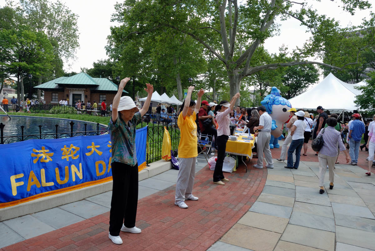 一早在法兰克林公园里人群川流不息,各式各样出售工艺品和饮食的摊位布满了整个公园。介绍法轮功的展位在当天是个热点,不少学员在展位旁做法轮功的功法演示,吸引了很多人驻足观看,有的在公园的长凳上坐了很长时间认真地观摩法轮功的功法演示,久久不愿离去。不少西方人一边看一边索取法轮功的资料,如饥似渴地阅读着。当他们知道法轮功正遭受中共的迫害时,都皱着眉头,摇着头表示不可思议。很多人当场签名表示支持法轮功,反对中共的残酷迫害。