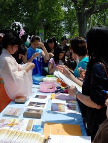 ![]() 很多人停留在法轮功学员的展位上,学折莲花并了解真相 |