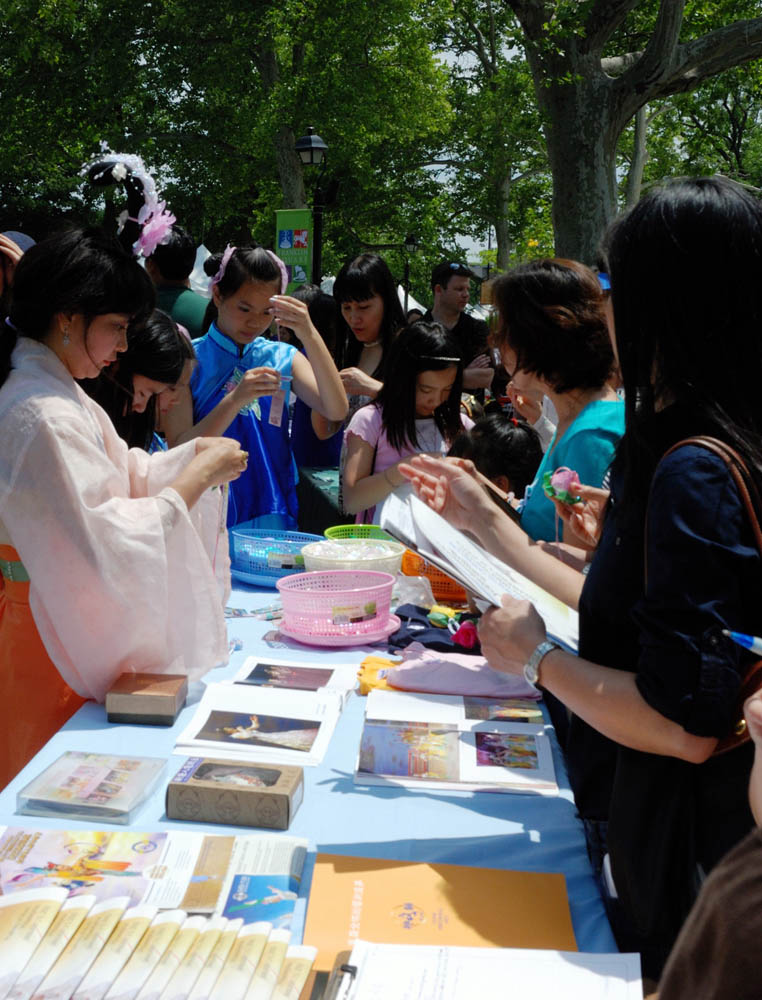 介绍神韵演出的展位一早就被围得水泄不通,不管是亚洲人还是西方人都被神韵画册上那精美独一无二的图片所吸引,当他们了解到神韵是世界顶级水准的演出,在世界艺术界已享有崇高的盛誉等等情况后,纷纷在登记簿上填写了联系电话想去看下次的神韵演出。