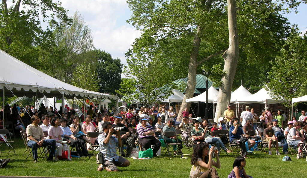 ![]() 第三届亚太传统月活动中,人们在观赏大费城明慧学校学生表演 |