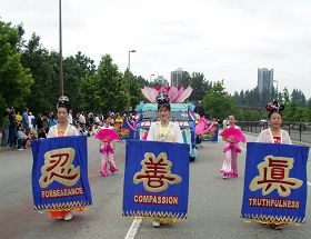 ![]() 游行中的真、善、忍横幅。“真、善、忍”是法轮大法的修炼原则。 |