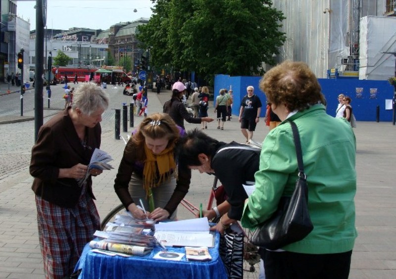 ![]() 法轮大法学员在芬兰首都赫尔辛基火车站前举办活动,传播真相 |