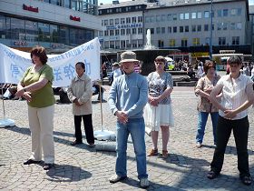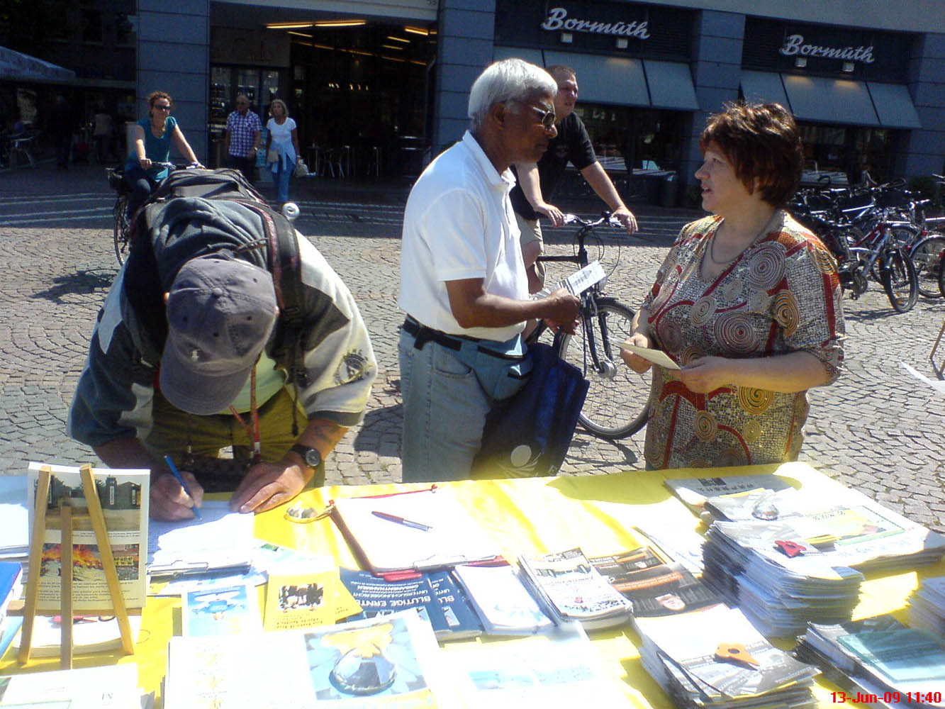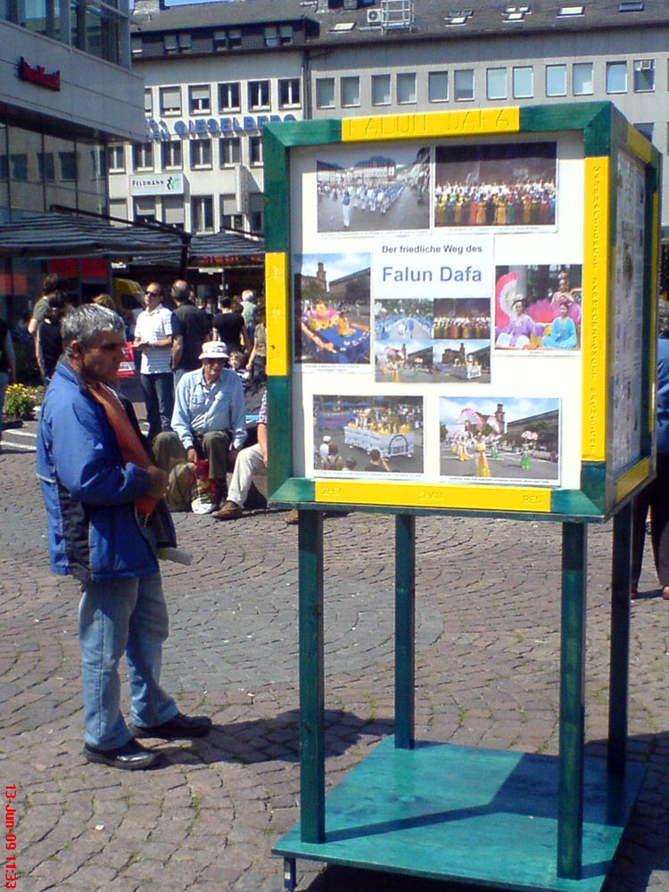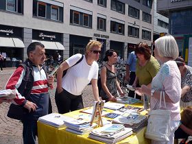 一位周末逛街的德国女士安静地看完传单后,默默签名声援法轮功。大约一小时后,她又回来询问怎样才能在本地学炼法轮功。学员一边为她找联系方式,一边向她讲述如何开始学炼。她一手按在胸口,大声地说:“虽然我听不见,但我心里都明白。”