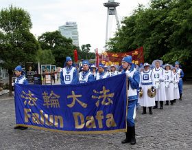 下午七点左右,由一百多人组成的队伍从雷本(Rybne)广场出发,开始游行。伴随着行进的鼓声是小号、长笛、单簧管和长号的演奏。鼓声尤其对路人起到了震撼的作用,许多人停住脚步,看看到底是怎么回事。一位男士打电话告诉朋友:“这里正举行法轮大法的游行,快来看看吧。”旁观的人接过学员发的资料。