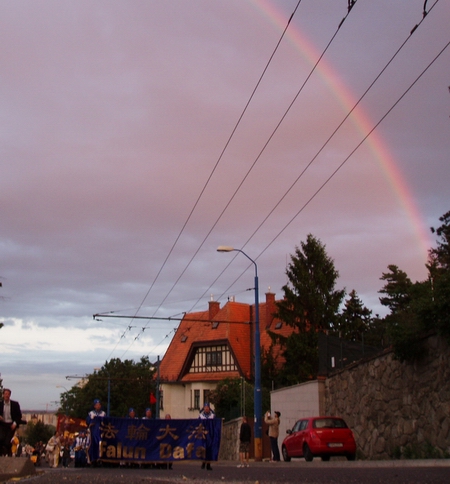 游行队伍穿过老城区,走过城堡,向山顶进发。山后出现了一条半圆形彩虹,尽管上山的路很累,但美丽的彩虹对游行的人们是个鼓舞。游行在中共大使馆旁结束,天国乐团在那里又演奏了几首乐曲。