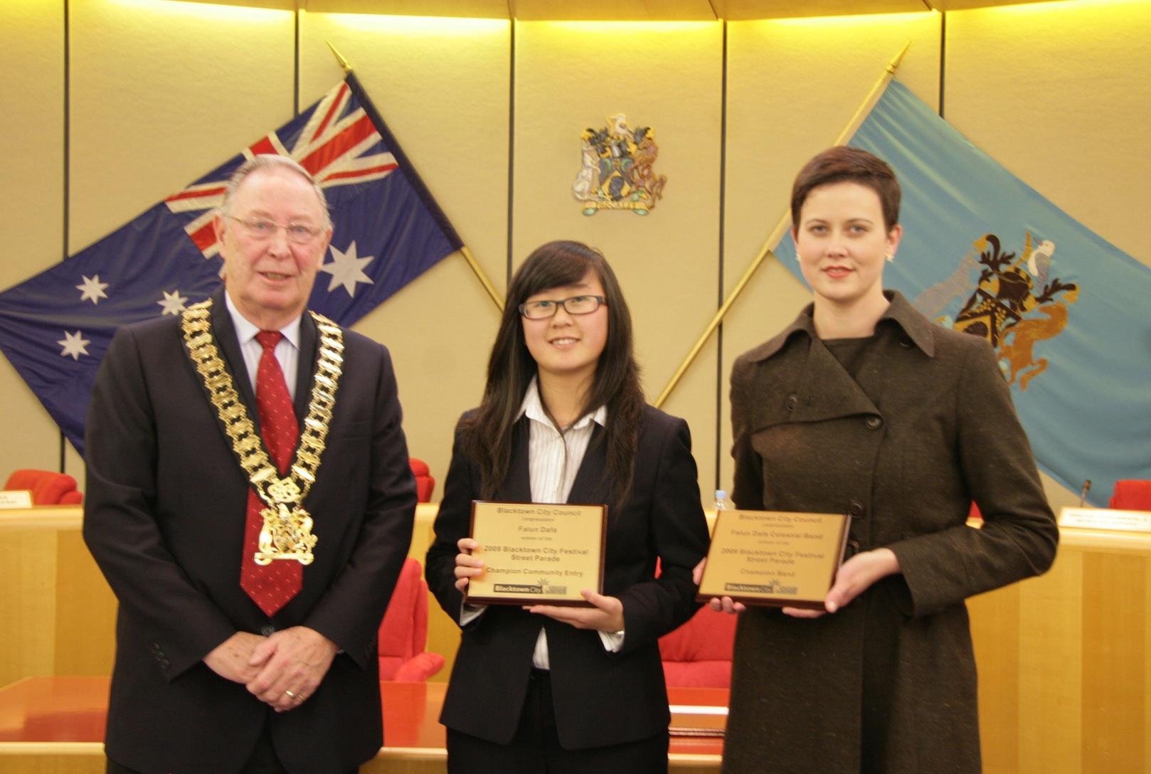 ![]() 布莱克镇市长(左)向法轮功团体代表颁奖 |