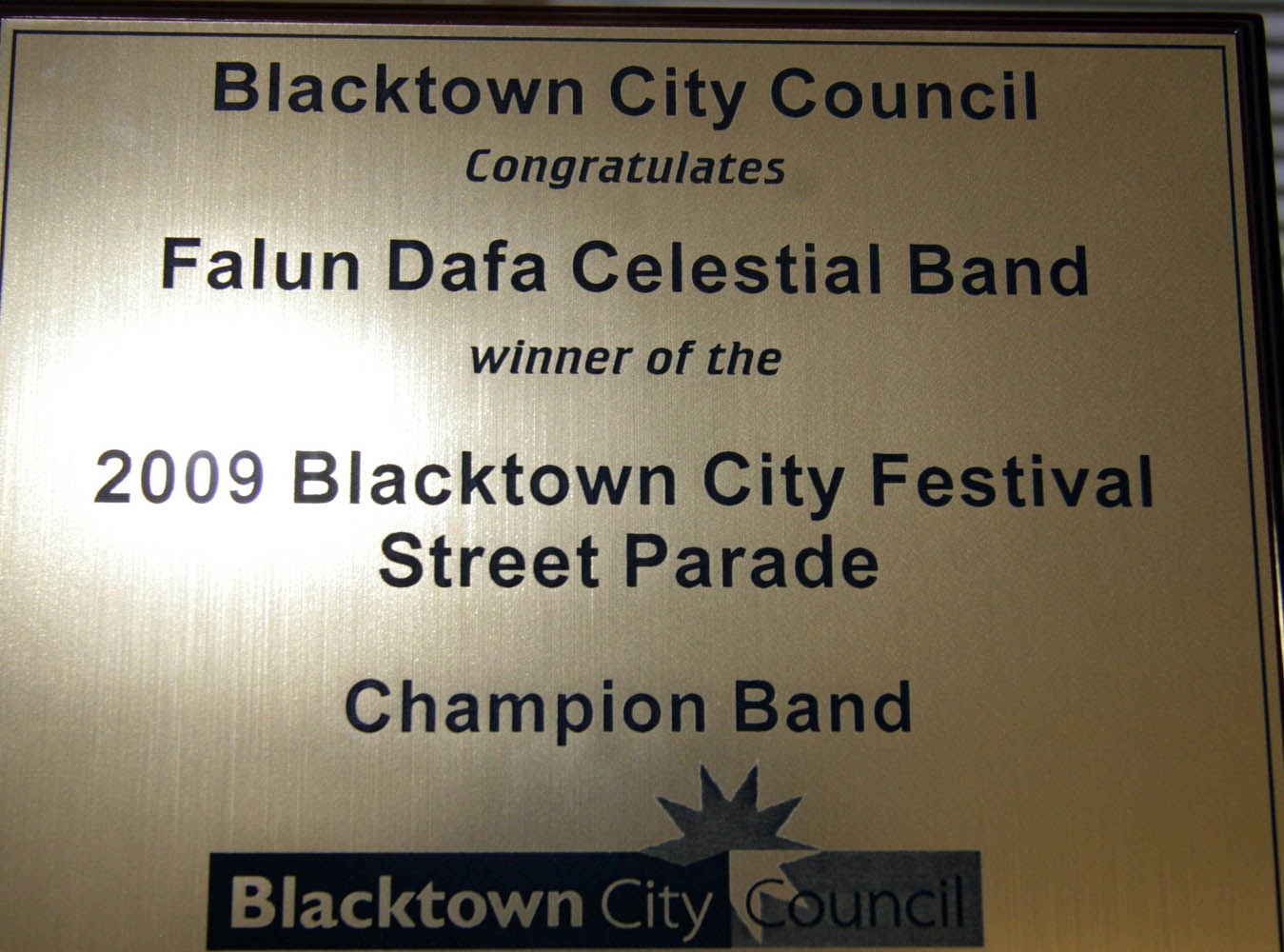 ![]() 法轮功学员组成的天国乐团获得悉尼西部布莱克镇节日大游行乐队冠军奖牌 |