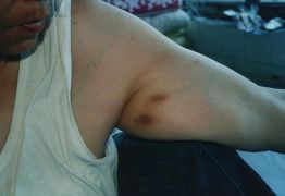 李凤珍被直接送到洗脑班(迁安市老种子公司)三楼,从楼门开始,恶警就拉着手铐往上曳李凤珍,导致腰等部位拉青(如图,照片为五月二十日拍摄)。洗脑班头子杨玉林上去就打李凤珍的嘴巴,三颗牙被打活动,当时嘴角就留出了血。