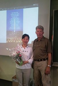 宗教课老师送上鲜花和巧克力以感谢瑞姆先生(右)和滕女士(左)的中国人权报告 |