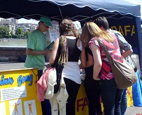 每次信息日活动中都会有人因为看到法轮功的真相材料后而开始学炼法轮功。多米尼卡(Dominika)女士也是其中之一。在一次活动中,她得到了法轮功的信息材料,就去了炼功点学炼功法,但是没有坚持很久。今天再次看到法轮功的信息摊位,她在回家后再次来到摊位前,签名并和法轮功学员交谈。