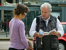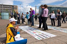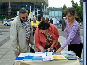 一位来自美国的游客看到了横幅上的中文标题后,用流利的中文告诉在场的华人学员:他在台湾居住了三年,在台湾他就了解了法轮功在中国大陆被迫害的信息,他还知道台湾有几十万人修炼法轮功,没想到来德国旅游又见到了法轮功,他很高兴。