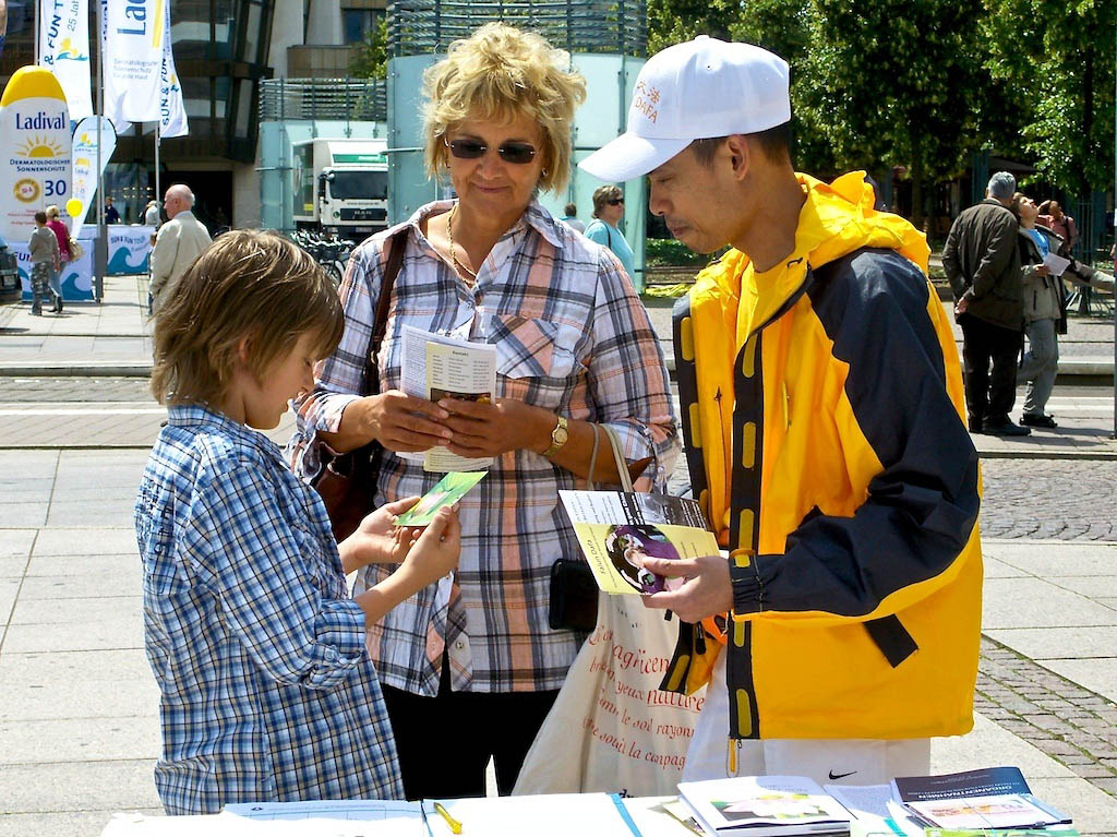 一位德国母亲带着两个孩子来到信息桌前,还没等学员给她解释情况,她就拿起笔,在呼吁制止迫害的征签表格上,认真签下了自己的名字。她说:“我对共产党太了解了。你不用告诉我,我也知道你们展板上写的共产党对你们的所作所为都是真的,因为我以前就曾经生活在共产制度中。”母亲还把孩子领到展板前,一一给他们讲解,让孩子从小就了解共产暴政的反人类罪行。