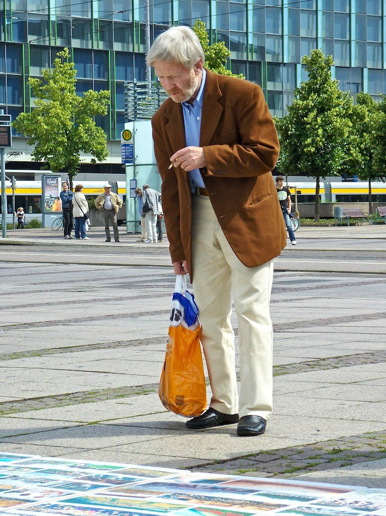 ![]() 仔细阅读法轮功真相展板的德国老人 |