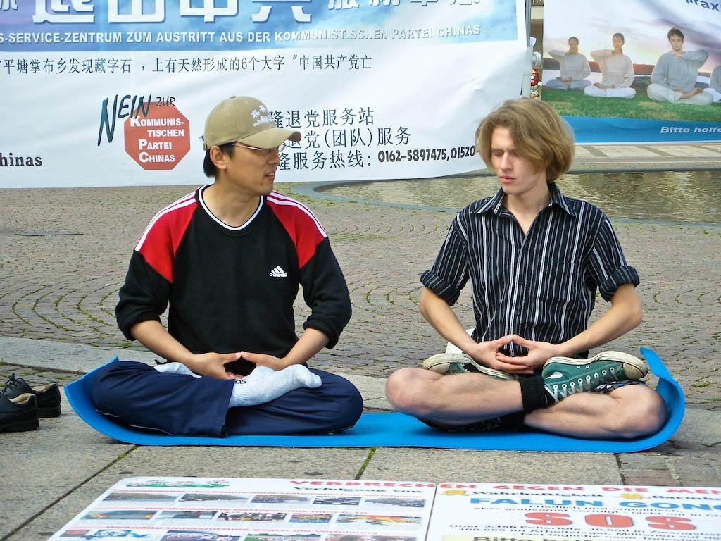一位德国小伙子远远的就被学员展示的第五套功法的打坐动作所吸引,他好奇地跑过来想知道这里在做什么。在了解了法轮功真相后,他兴奋地要求马上开始学炼功法,而且在短短的几分钟之内就用标准的双盘动作学起了第五套功法。事后,他对学员说:这么好的功法,以后一定要继续学下去。
