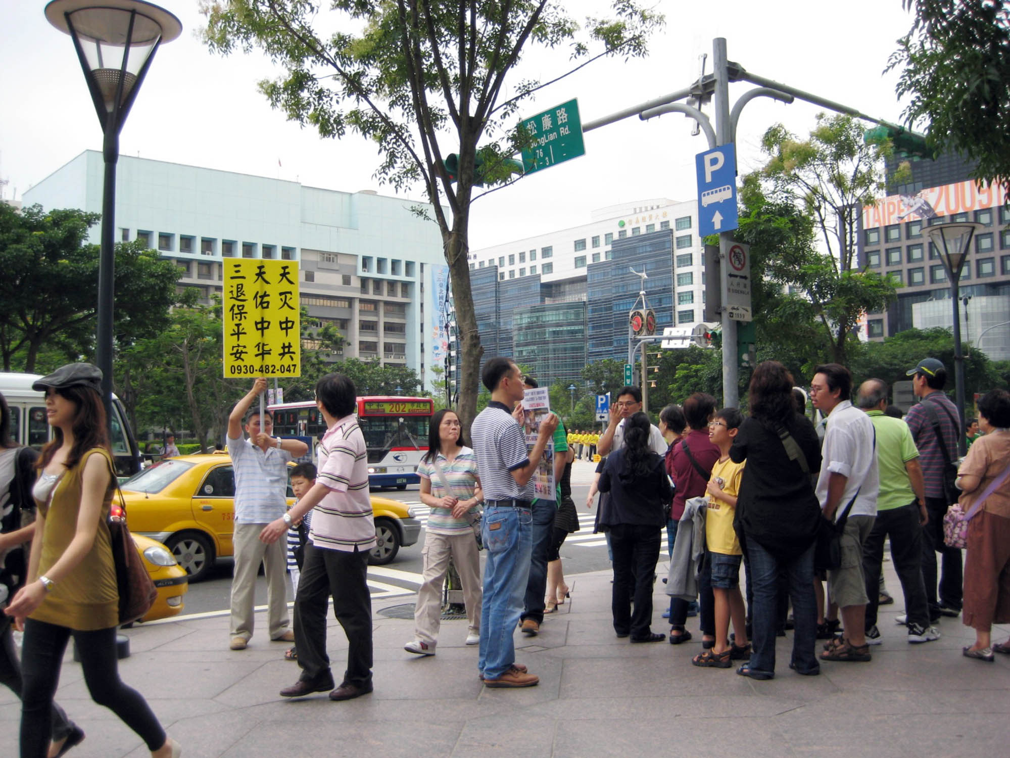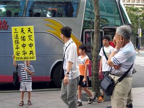 人行道上举着展板的人随机调整位置或角度,方便观光客阅览,有的分送资料,声声提醒来自中国大陆的观光客:“欢迎来到自由国土,看到在国内看不到的殊胜景象,请把握机会了解法轮功真相,三:退.(退出中共党、团、队)保平安。”