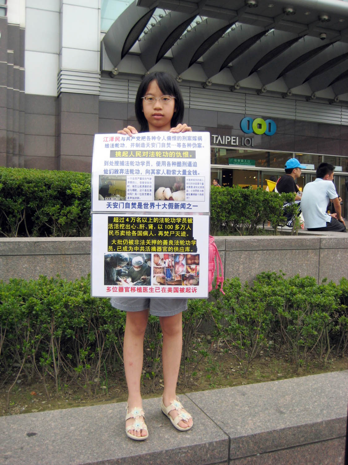 位于大楼右侧对街的信义广场,每天下午近四点时分,总有那么几十人,身着印有“法轮大法”或“真善忍”字样的金黄色上衣,随着悠扬悦耳的音乐演示五套功法,神态祥和庄严,动作优美典雅。行人有的侧耳倾听,有的驻足观看,一零一楼前休憩广场,或坐或立的观光客有的低声耳语,眼光不时飘向炼功队伍,有的行走间故意调过左右位置,为求与同伴讲话时可以不露痕迹地将展板图文尽收眼底。