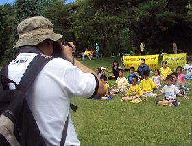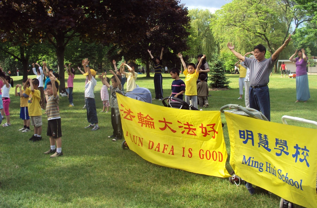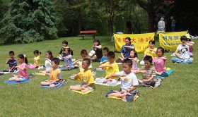 明慧学校的老师带着孩子们在草坪上拉起了“法轮大法好”的横幅,在祥和的音乐中炼起了五套功法。一批一批的游客止步观看孩子们炼功,人们照像、录像,接资料并询问法轮功的情况。了解真相的人们都满意地离开了。