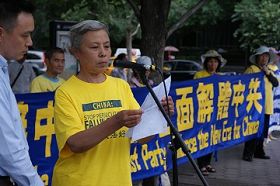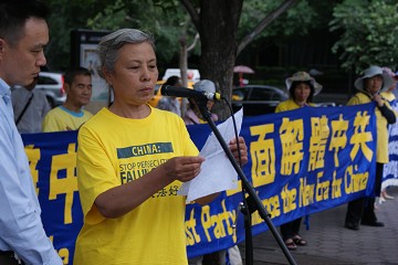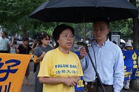 ![]() 法轮功学员戴英在集会上,讲述了自己遭受酷刑折磨的经历。 |