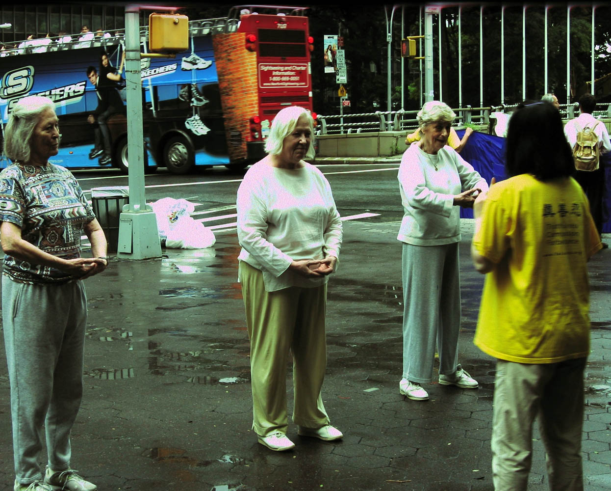 纽约法轮功学员从早上十点就来到了联合国外,冒雨请愿一直到晚上六点,他们表示,迫害一天不停止,这样的呼吁就不会停止。这一天,法轮功学员美好和平的炼功场面吸引了有缘人前来学功。