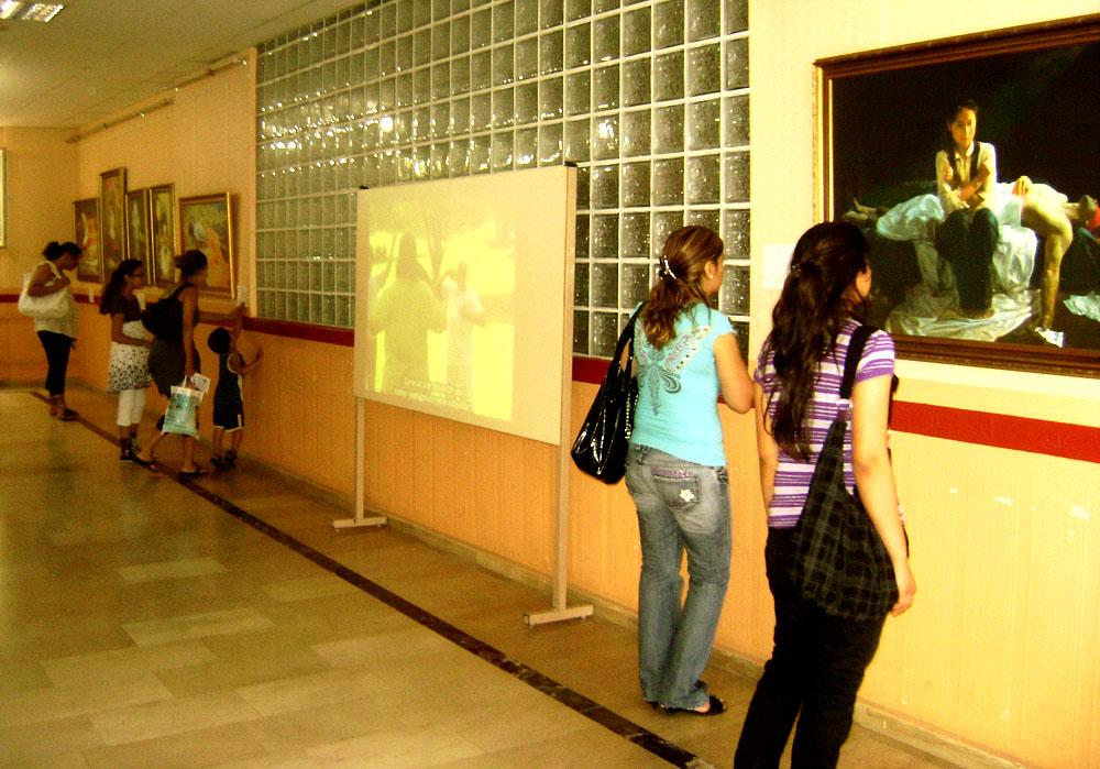 这次画展特意在展厅里增设了一台投影设备,反复播放着几部关于法轮功真相的录像片,这对每位参观者能进一步了解法轮功(又称法轮大法)、认清中共的邪恶本性以及更好地领会每幅画作所蕴含的真义起到了很大的帮助作用。