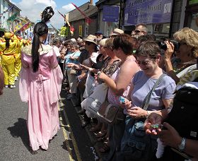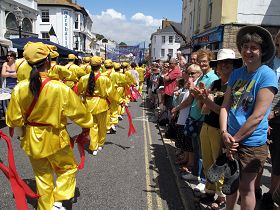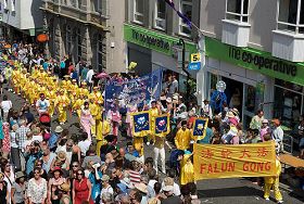 在法轮功学员游行队伍的最前面,“法轮大法”横幅在阳光下闪着金光,“真”“善”“忍”以及“世界需要真善忍”横幅紧随其后。二十多位中西法轮功学员身着崭新的金黄色炼功服,伴着“法轮大法好”的音乐,在街道两侧观众形成的人墙之中迈着整齐的步伐、击出有力的鼓点。三位女学员扮作美丽的仙女向夹道观看游行的人们一路发放莲花。观众们不吝表达自己受到的震撼及其对法轮功队伍的喜爱,人们纷纷掏出相机、摄像机和手机,口里赞叹着:“太美了!”“我喜欢这音乐!”“我喜欢这颜色!”很多人在鼓掌,无数双手伸向被发放的莲花,拿到莲花的人们立即仔细看莲花悬挂的标签上的信息。