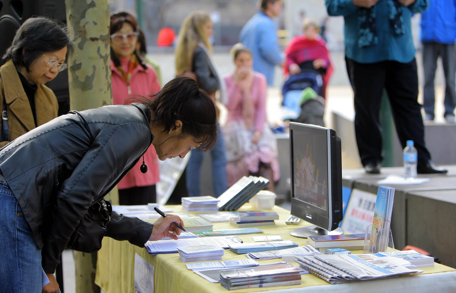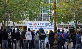 退!党!集会吸引了大量的民众观看,明白了真相的人们纷纷签名,声援三:退.(退出中共党、团、队),并呼吁制止中共对法轮功的迫害。