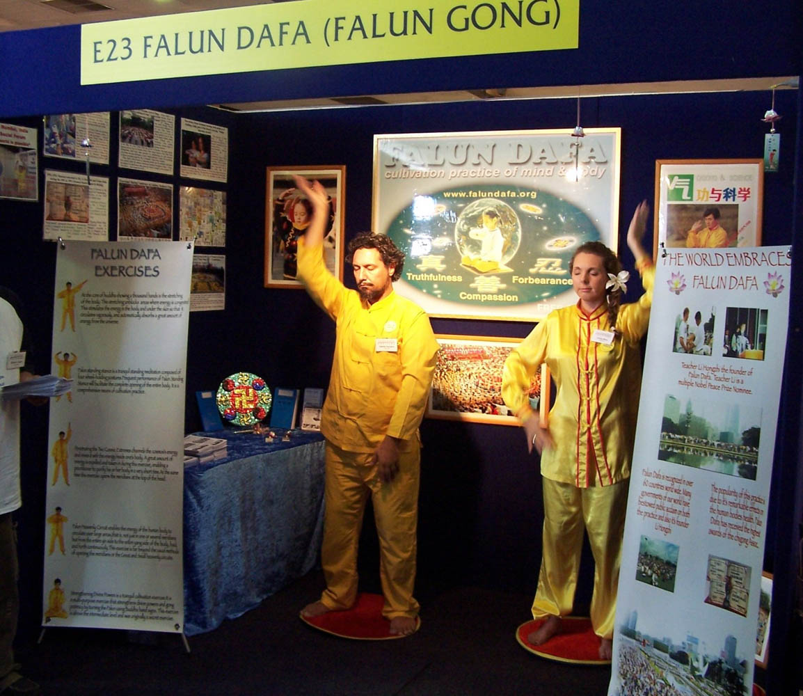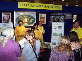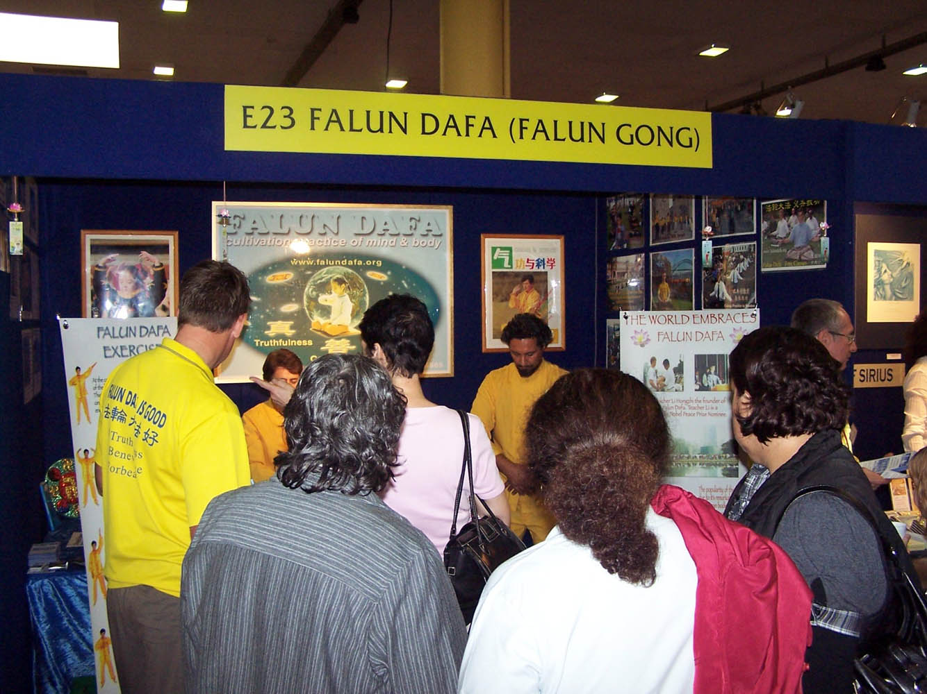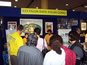 展位上挂满了法轮功洪传世界各地的炼功照片,许多人停在展位前观看学员们展示法轮功的五套功法,并且排队索取传单。一些人表示对功法很感兴趣,希望得知炼功点的信息;也有些人听说过法轮功被中共迫害的情况,想进一步了解真相。