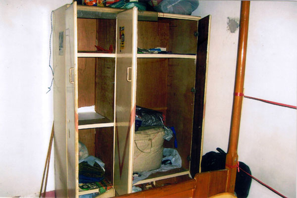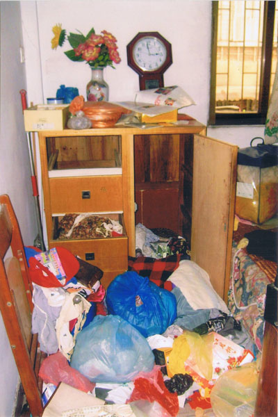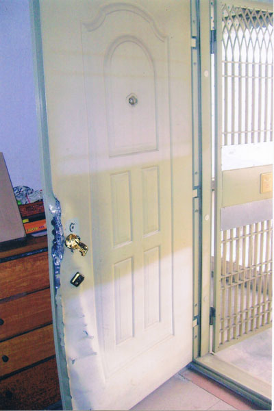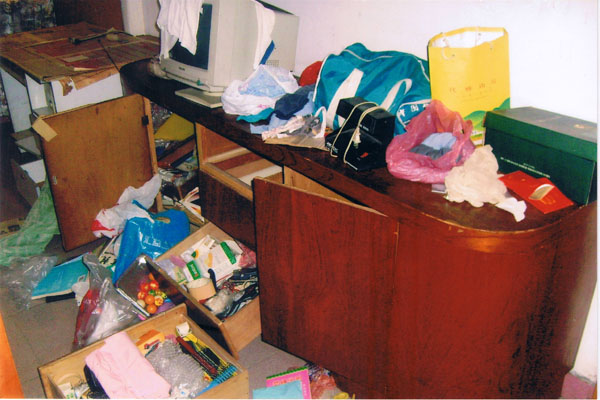 以下图片是黄秀英家大门被硬物撬破以及家中物品被乱翻的狼藉。