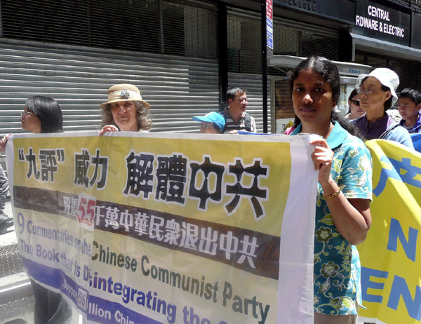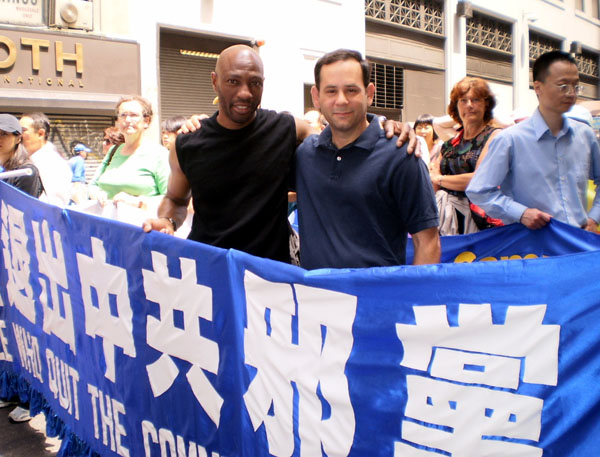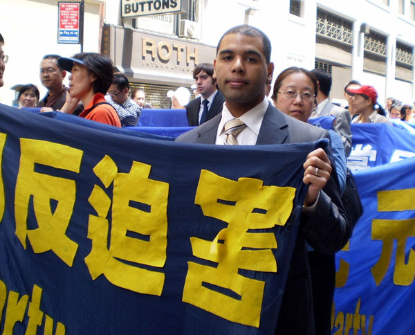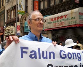 修炼法轮功已六年的昆提(Quentin Bellow)是纽约当地学员,他告诉记者修炼使他的健康得到立竿见影的改善,外表看起来也好很多,“修炼法轮功使我觉得更自在。”昆提说“真善忍”是非常棒的修炼原则,每个人都应该知道。“我今天来参加游行,希望让更多人了解发生在中国的迫害,这场浩劫已经十年了,必须被制止!”