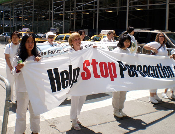 来自加拿大渥太华的凯茜(Kathy Gillis)修炼法轮功十一年了,“法轮大法不仅令我身体健康,还使我的生命更富有意义。以前,我觉得我应该有所作为,但不知道该做什么,(修炼大法后)我找到了。”凯茜手里举着呼吁制止中共迫害法轮功的横幅,对此,她说,“当第二次世界大战的时候,在集中营中所发生的屠杀是令人发指的。那时我还是个孩子,我非常震惊人们没有做出足够的努力去制止那样的悲剧,我也很震惊那时大人们没有告诉我发生着什么。我发誓,不能让那样的事重演。”走在游行队伍中,凯茜呼吁人们关注迫害,早日制止中共的暴行。