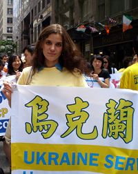 来自乌克兰的塔提娜(Tatina Skulkinia)从二零零一年开始修炼法轮功,“修炼使我变得更平和与善良,以前我可是很爱生气的。修炼前我经常喝酒,你知道俄国那里的年轻人很多都这样,学了法轮功,我不再喜欢喝酒了,身体上的疾病也消失了。我丈夫也炼法轮功,修炼对我们的家庭生活很有帮助,因为遵循‘真善忍’,我们知道应该怎么解决矛盾。”谈到为什么来参加今天的游行,塔提娜说:“我知道法轮大法好,他带给人们一切美好。我非常荣幸能够参加这个大游行,和这么多来自世界各地的法轮功修炼者在一起。这是如此的美好,我真的找不出语言来描述这有多么好。”