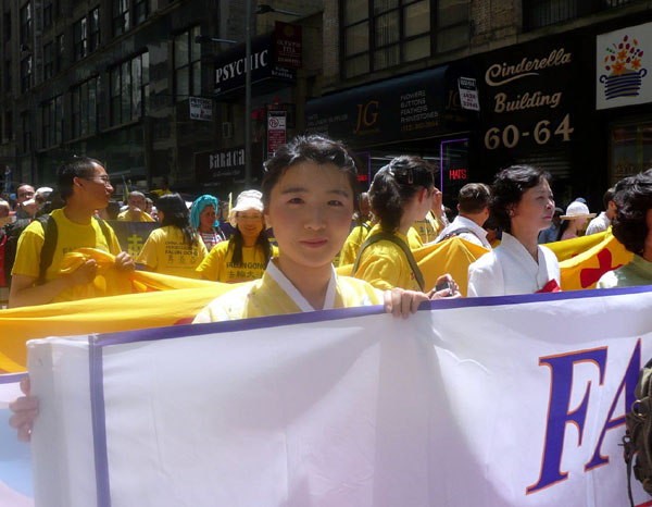来自韩国的赵英伊今年十七岁,她在七岁的时候就开始跟妈妈一起学大法。她说:“修炼这么久,我知道大法的美好,身体好了,学习好了,跟同学的关系都很好,小朋友们都很喜欢我。”问她为什么来参加这个大游行,她说:“我觉得这个活动很重要,有那么多法轮大法弟子从世界各地赶来,所以自己就想这是一个很好的机会,大家‘比学比修’。”