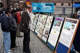 展板刚刚摆放上就有一位瑞典女士对学员说:“我能不能给你们一些钱。我知道中国共产党做了很多的坏事,我是很清楚它们(中共)就是谎言加欺骗。对法轮功所做的这些恐怖的坏事也只有它们能做得出来。现在就是要让更多的人都能认清它(中共)是个什么,你们做的对,我永远的支持你们,祝你们成功!”
