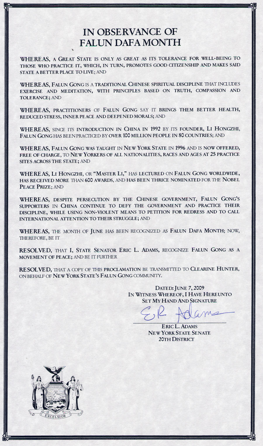 因此,我,纽约州参议员,艾瑞克•亚当斯认为,法轮功是一个和平的运动;