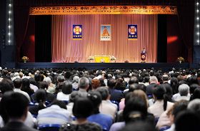法会会场庄严祥和,由于前来参加法会的人数众多,一个会场装不下,还有四个分会场。在主会场的主席台上芬芳四溢,上方正中是师父的大法像,两侧是“法轮常转”和“真、善、忍”的法轮图形。九朵结满了莲子的大莲花点缀在法会会场两侧。和主席台相呼应的对面,是“真、善、忍”真言,两侧各有两面法轮图。