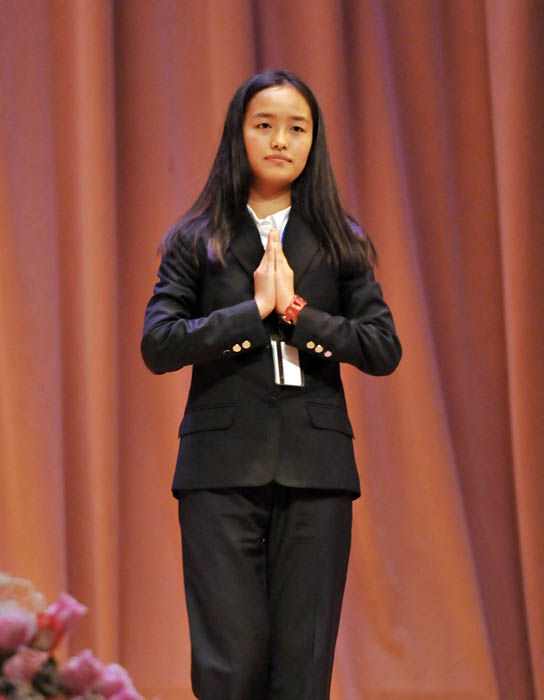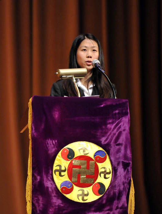 下午的法会由天音二团的小提琴手黄月开场。今年十九岁的黄月四岁就和妈妈一起走進大法。在大陆的风风雨雨中,亲身体验着大法的超常。去年来纽约帮忙神韵晚会卖票,领悟到了神韵艺术学院是宇宙中最好的学院,再也不牵挂常人社会的名牌大学了。克服了父亲的反对,她進入了神韵。在消业中感受到师尊的巨大付出。在神韵的巡回中,看到了神韵艺术团成员们为救度众生而刻苦排练的精神,相互激励。