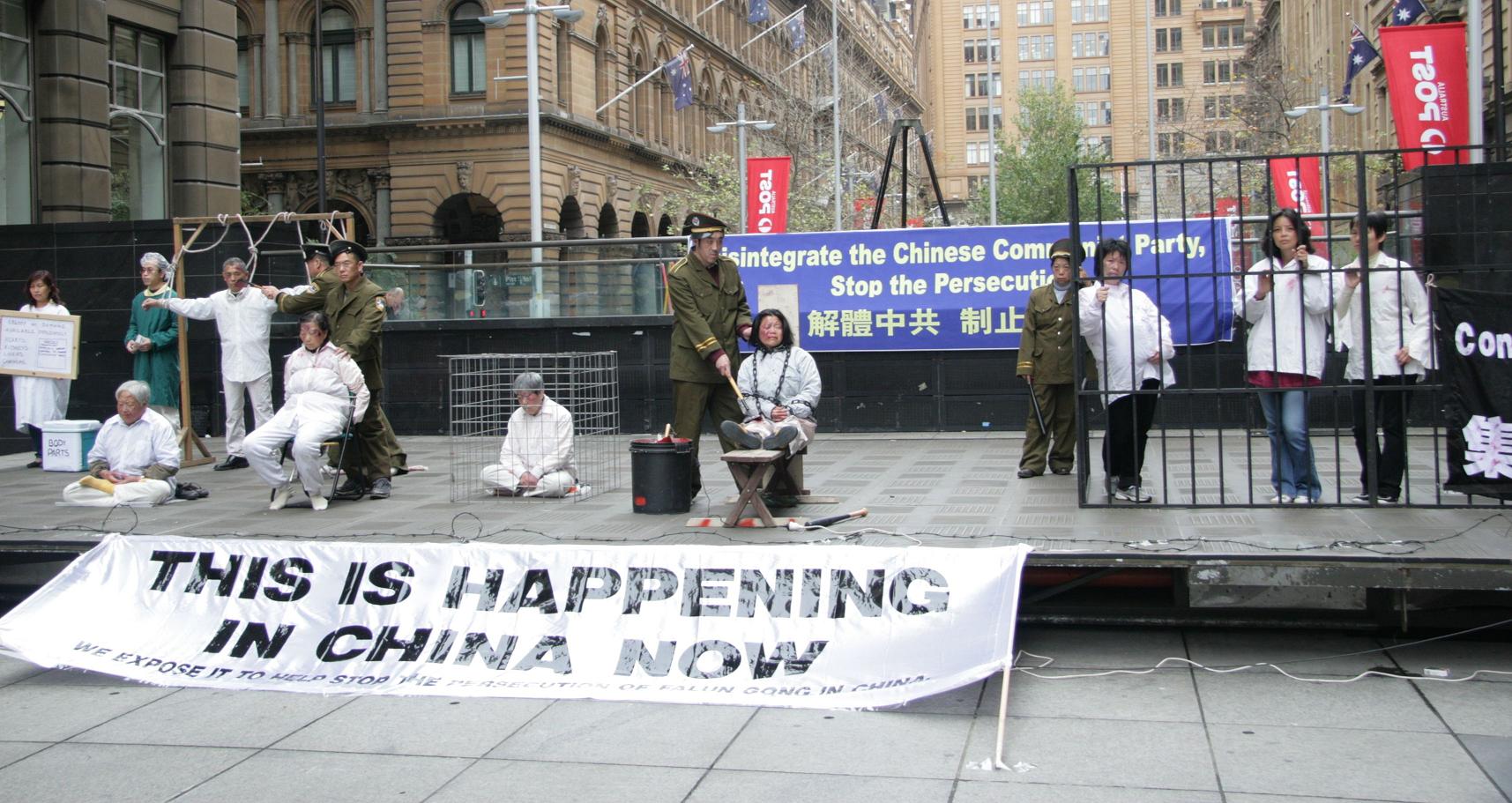 中午时分,广场中心露天舞台上的大型反迫害酷刑展震撼了善良的澳洲人。七十岁的法轮功学员王纯英女士讲述了她全家人因修炼法轮功而遭中共迫害的经历,她流着泪说:“参加这个酷刑展就好象我现在看到了我的女儿、我的儿子在受到迫害的情景。当年我的儿子被抓进天津市红桥区劳教所,从大门到关押他的地方也就是五、六十米的路程,但却走了两个半小时,一边走,恶警一边打他,他头上、鼻子、嘴、身上流满了血,恶警将他打倒在地,等人站起来又接着打。他是个修炼的人,若是常人早就被打死了。”她呼吁全世界善良的人们都来帮助制止这场迫害,让法轮功“真、善、忍”的美好传遍全世界。