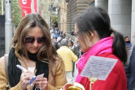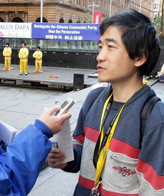 来自北京的番平先生向法轮功学员表示:“我非常的敬佩你们。我有几个好朋友是法轮功学员,我觉得他们都是好人。我也很想学炼法轮功,但是我上班很忙,没有时间。我十分反感中共迫害法轮功,我很愿意支持你们,但是我不知道该怎么做。有的时候我去堪培拉游玩,在中国使馆前看到你们在那拉横幅抗议,向中国游客发真相资料,我就跑过去帮助拉一会儿横幅,还帮着发发真相资料,我能做的就这些了。我相信如果大家都知道真实的情况,大家都会反对这场灭绝人性的迫害的。我也希望全世界的人们都能起来制止这场迫害。