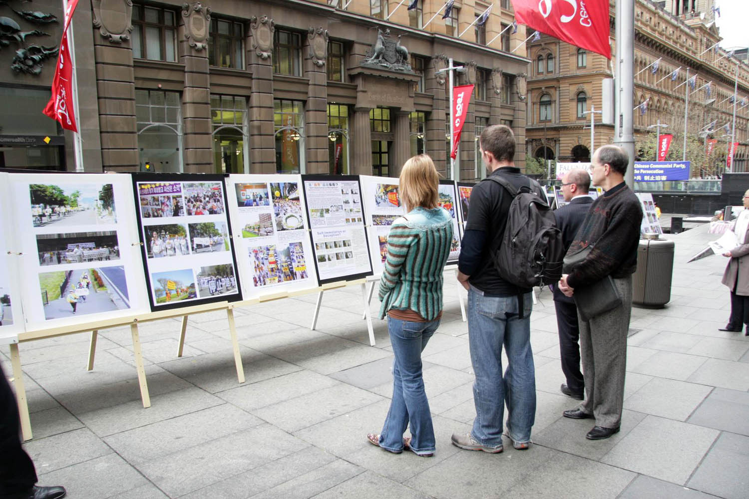 法轮功学员还在广场上设置了信息台,摆放各种真相资料,大屏幕投影机不断地向过往行人播放法轮功在世界洪传的盛况以及发生在中国的迫害真相。广场的两侧摆满了法轮功真相展板,吸引了许多澳洲人仔细观看。大法的美好和中共的邪恶形成鲜明的对比,触目惊心的迫害图片令人动容。