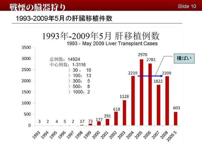 ![]() 1993年-2009年5月肝脏移植数据明显看出数量的增加。 |