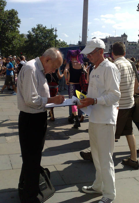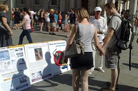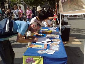 一个西人小伙子路经广场在展板前停下了脚步,学员上前递给他真相资料,他并不急于接,而是认真的观看展板上的信息,然后再接了资料,并向学员询问了很多关于迫害法轮功的问题,学员向他讲述了法轮功真相,并询问他是否能为制止迫害法轮功签名,小伙子在征签表上毅然签上了自己的名字。