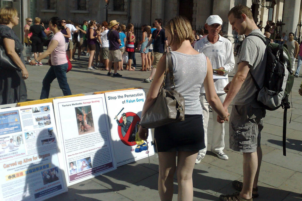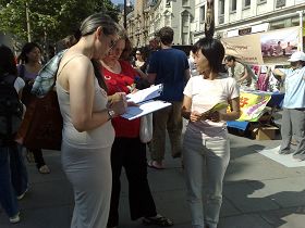一对操四川口音的母女和她女儿的外籍男友走到展板前也停住了脚步,学员上前递给他们光盘和中文资料,母亲看着展板,感慨的说她在迫害前也炼过法轮功,学员当即向他们讲真相,劝他们退出中共邪*党-的一切组织,母女俩欣然应允,用化名退出了邪*党-组织。