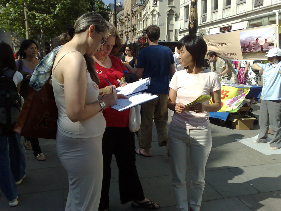 伴随着祥和的音乐,学员们向世人演示法轮功的五套功法,许多学员向行人派发法轮功真相资料,并征集反迫害签名。