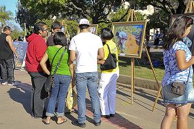 集会现场,法轮功学员打出了“解体中共才能结束迫害”的横幅。“坚忍不屈的精神”画展在同一地点举行。游人纷纷驻足观看,很多人签下自己的名字支持法轮功学员的努力。