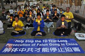 晚七点,法轮功学员进行了烛光守夜。他们盘坐成一个方阵,手举被迫害致死的法轮功学员的遗像,气氛庄严肃穆。不断有游人加入进来,为法轮功学员祈祷。