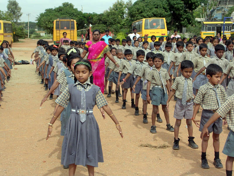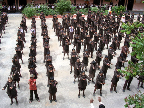 ![]() 图:印度尤提学校(JYOTHI SCHOOL)学生集体炼功 |
