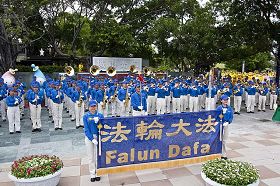 当天,游行的第一方阵由上百人的天国乐团开路,乐团演奏着《法轮大法好》、《法鼓法号震四方》、《法正乾坤》、《法轮圣王》、《送宝》、《佛恩圣乐》等乐曲,吸引道路两边的民众们引颈观望、赞叹不已。一位年轻的女士兴奋的说,除了国庆游行外,就是法轮功的游行最震撼了。
