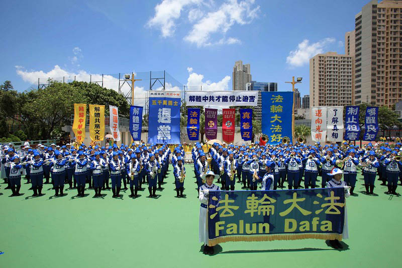 集会在长沙湾游乐场举行,上百名法轮功学员组成的天国乐团,为香港法轮功学员反迫害集会揭开序幕。