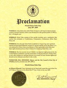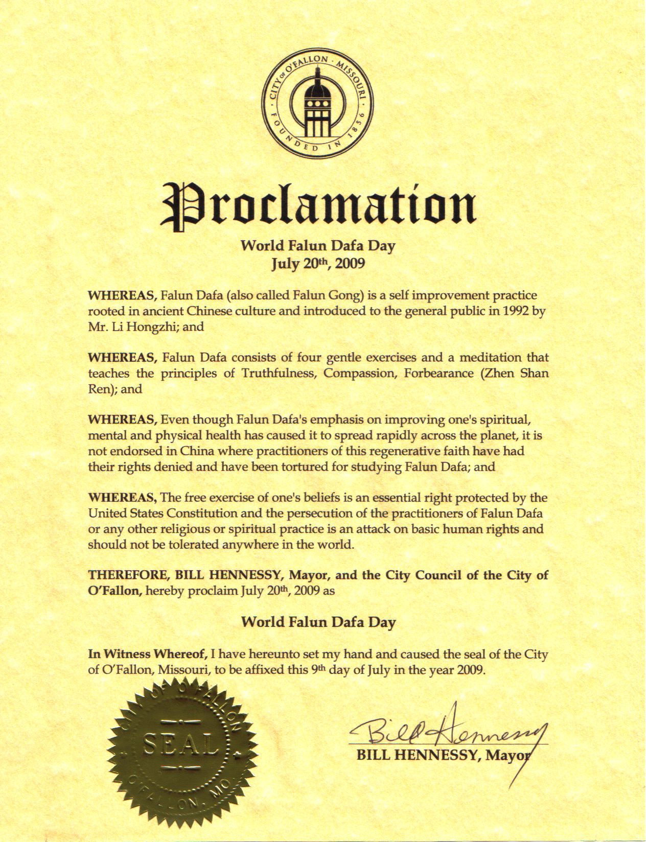 二零零九年七月九日,密苏里州奥法伦(O'Fallon)市长及市议会给法轮大法颁发褒奖,并表示,“信仰自由是受美国宪法保护的一项基本权利,对法轮大法修炼者和其他任何宗教或信仰信奉者的迫害是对基本人权的践踏,是世界上任何地方都不能容忍的。”以下为褒奖译文。